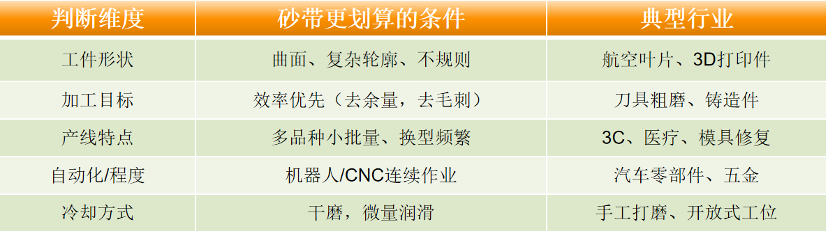一句话总结:粗磨、去飞边、焊缝打磨等“效率优先”的工序,砂带加工时间更短。